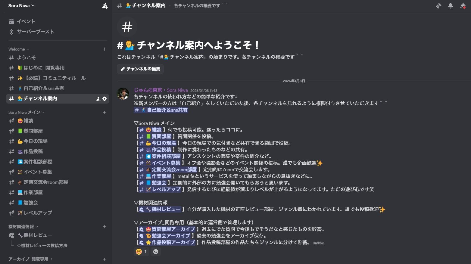 決済完了後、案内に従ってDiscordコミュニティへの招待リンクが送られてきます。Discordはテキストチャットや音声通話を通じてコミュニケーションを行うツールで、Sora Niwaでは複数のチャンネルが用意されています。作品共有や機材の話題、質問、雑談など、目的ごとに分かれているため、自分に合った関わり方が可能です。初めてDiscordを使う方でも、基本的な操作はシンプルで、すぐに慣れることができます。まずは気になるチャンネルを覗きながら、コミュニティの雰囲気を掴んでいきましょう。